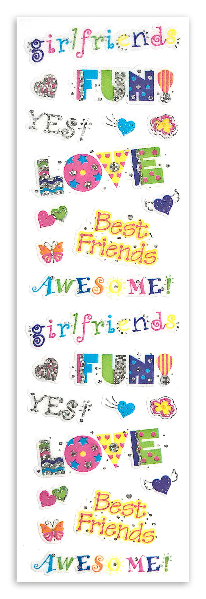 Cute and Sweet! Our fun Friends stickers updated in silver sparkle foil and new accents. On clear material.