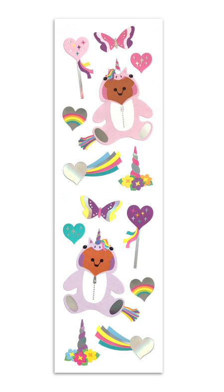 Limited Brights: Sweet bears in unicorn onesies, rainbow hearts and comets, butterflies, and more stickers are all accented in silver holo foil.