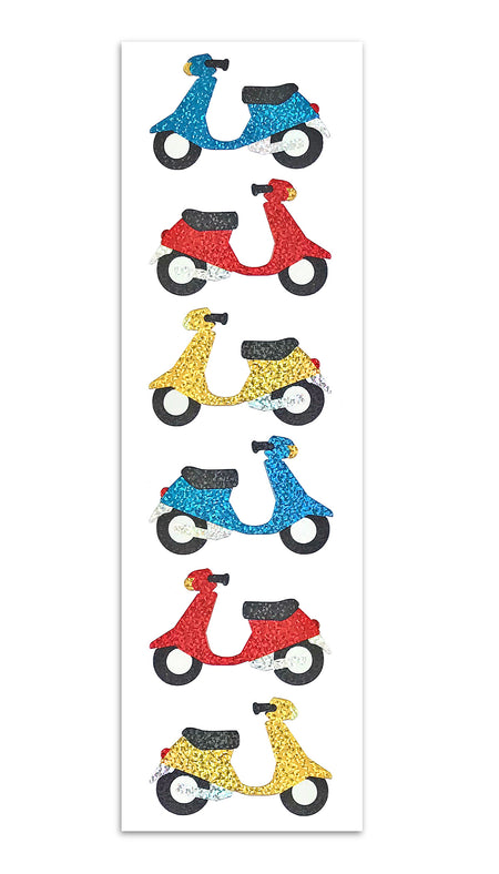 Last Call. Extremely small quantities available. These sheets are the very last of this Limited sticker. Classic Favorites: Dazzling retro scooter stickers in blue, yellow, and red sparkle material.