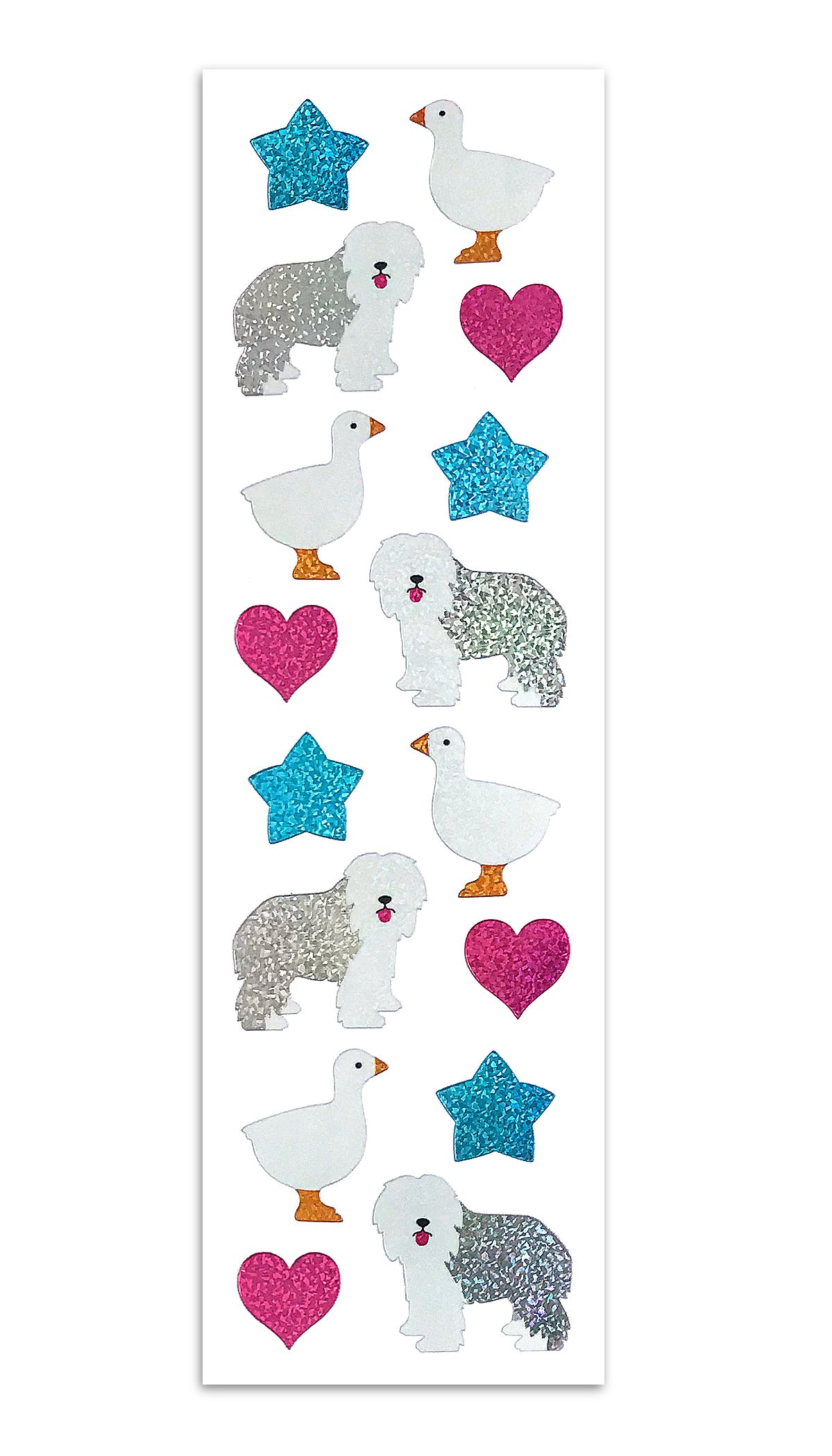 Last Call. Extremely small quantities available. These sheets are the very last of this Limited sticker. Spring Collection: Our sheepdog, goose, star, and heart stickers are all included in this very classic and very sparkly strip!
